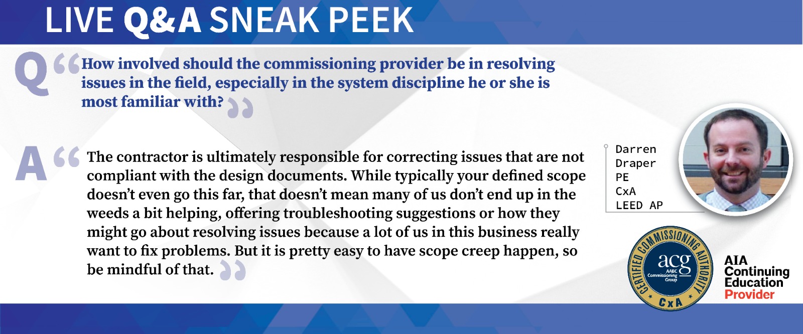 The AABC Commissioning Group (ACG) is offering a livestreamed version of its popular Certified Commissioning Authority (CxA) Workshop followed by a live 1-hour online Q&A session with its instructors to allow further explanation of concepts introduced in the recorded workshop.