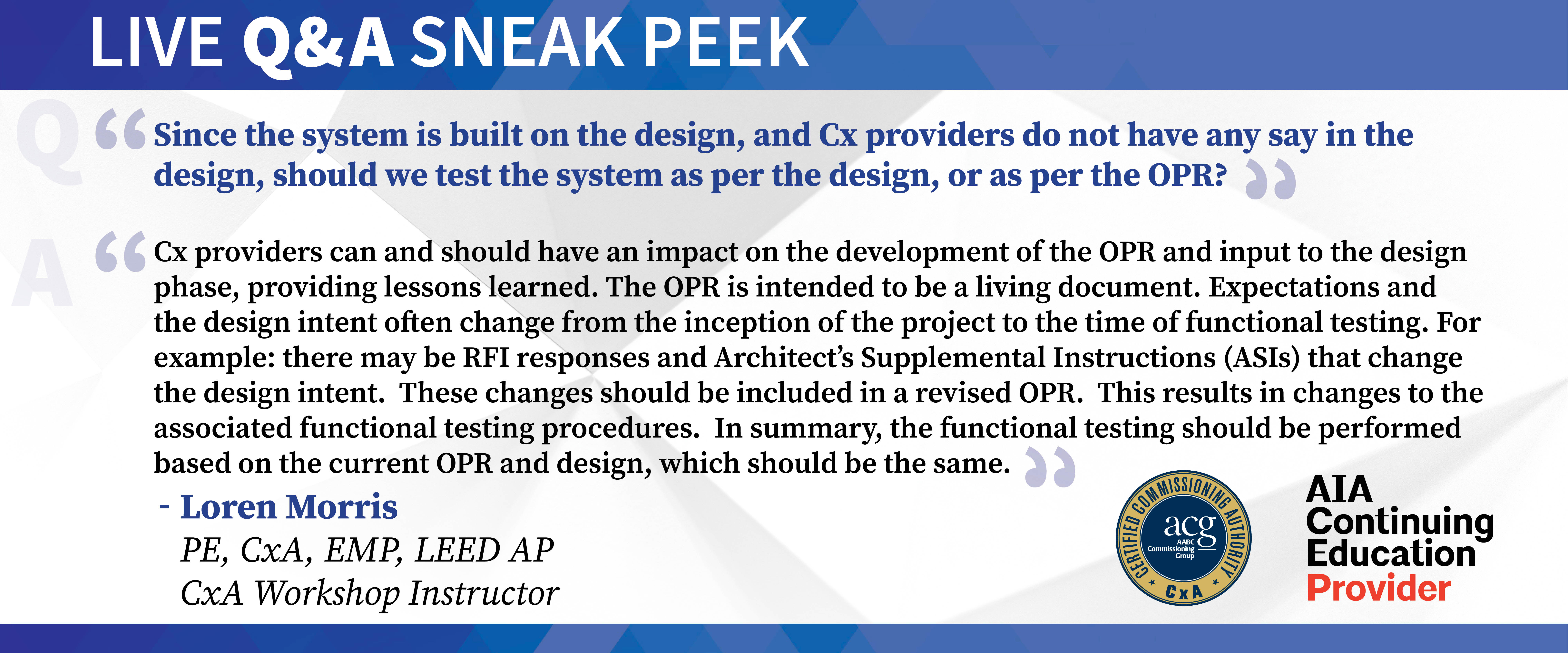 The AABC Commissioning Group (ACG) is offering a livestreamed version of its popular Certified Commissioning Authority (CxA) Workshop followed by a live 1-hour online Q&A session with its instructors to allow further explanation of concepts introduced in the recorded workshop.
